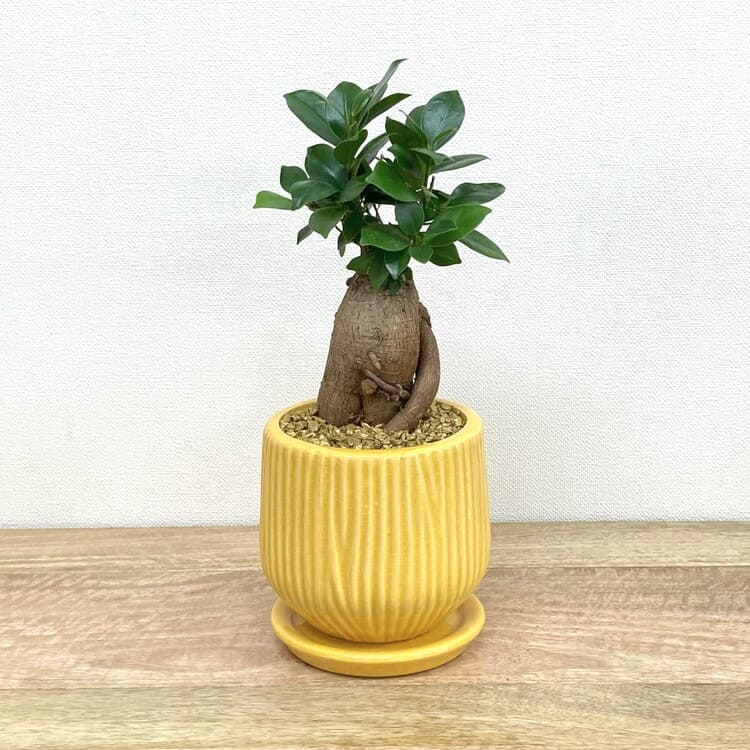 ガジュマル Mサイズ と植木鉢 MM063-130(イエロー) の組み合わせです。マルチング材はデコジャリ(ゴールド)になります。