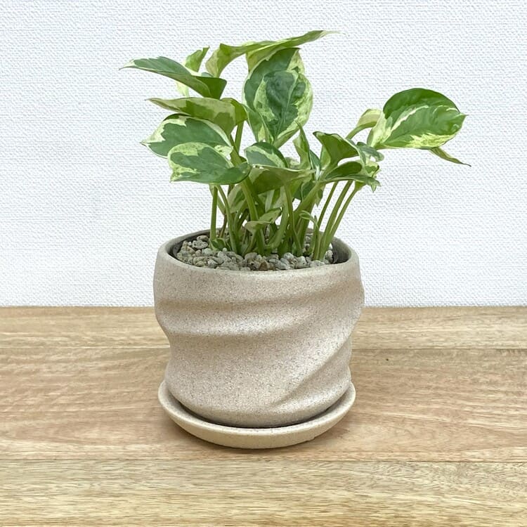 ポトス・エンジョイ と植木鉢 YD018-110(ナチュラルホワイト) の組み合わせです。マルチング材は軽石小粒になります。