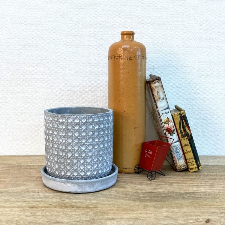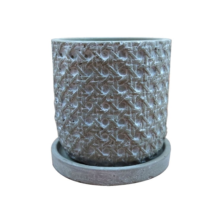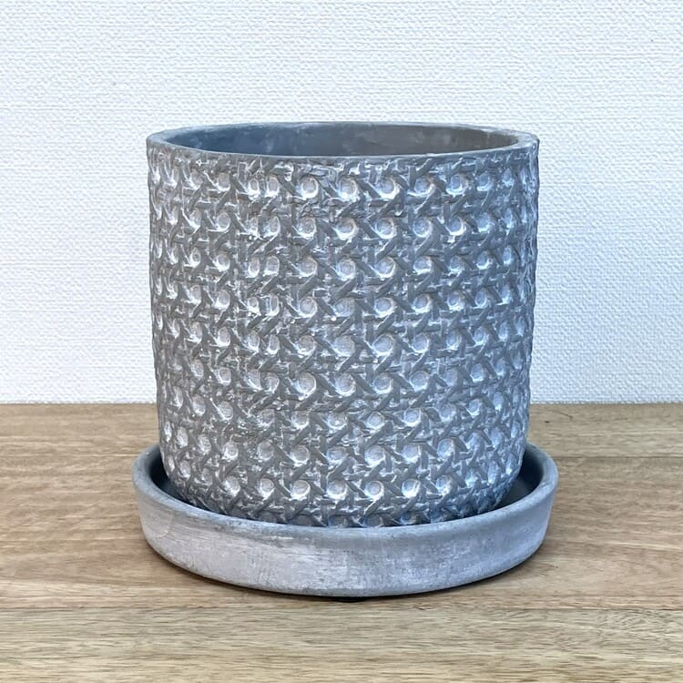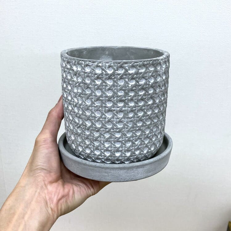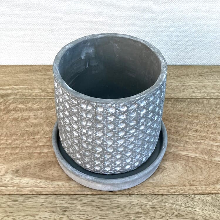 編みかごのような模様が全周に施されたセメントポット。彫刻のような立体を作ることができるのはセメント製品ならではの魅力です。シンプルな着色で嫌味のないデザインになっています。