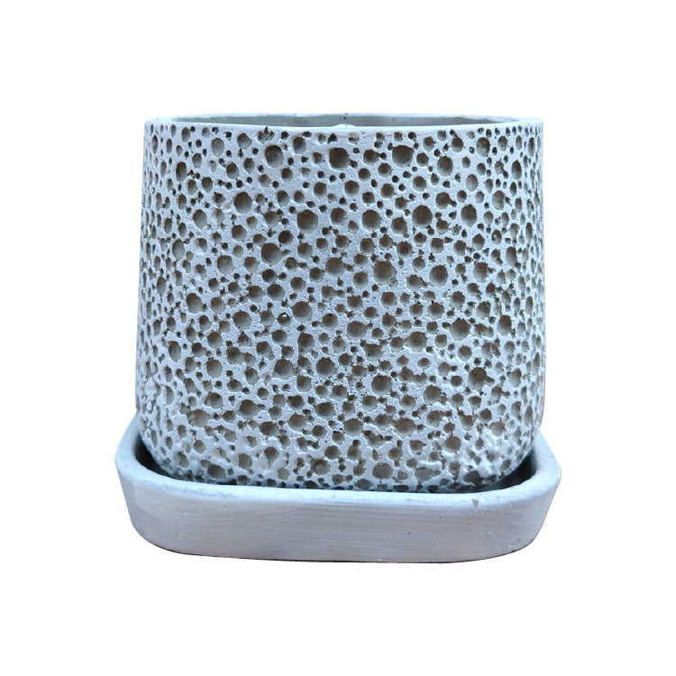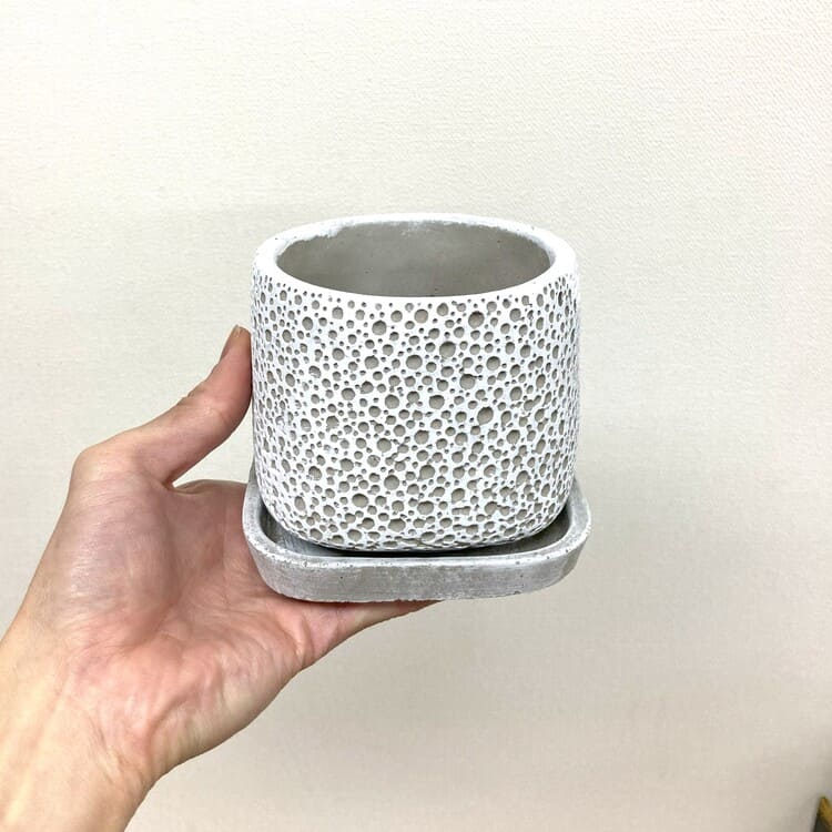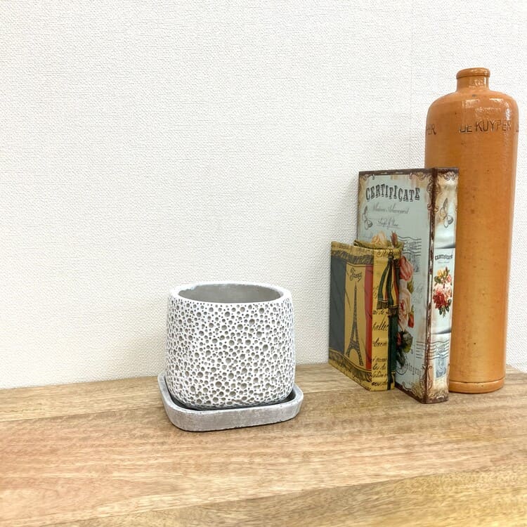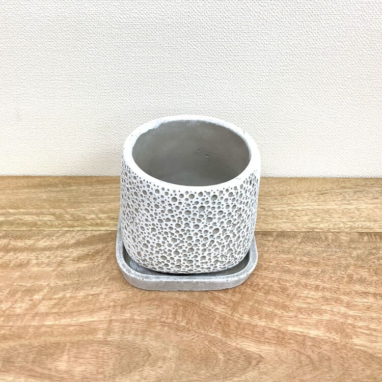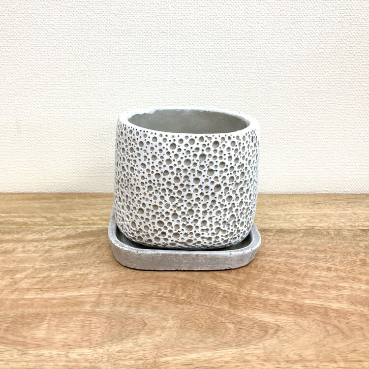 全体に気泡のような窪みがつけられたセメントポットです。口周りは円形、底部とお皿は四角型、変則的な形をしています。びっくりしてしまうような第一印象ですが、どこか愛嬌の感じられる不思議なデザインです。