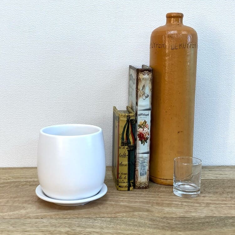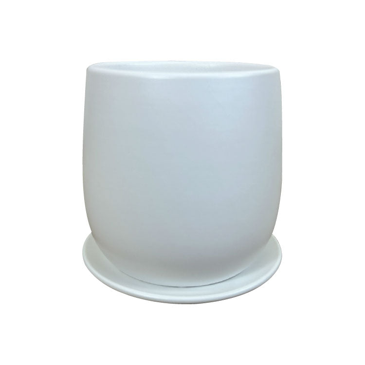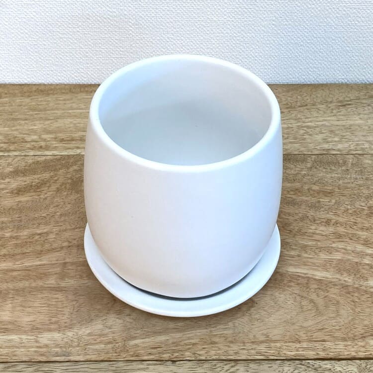 ゆるやかなカーブで描かれるやさしい姿の植木鉢です。白い釉薬はてかりが抑えられた半ツヤタイプでやさしい印象の仕上がり。自己主張ひかえめで組み合わせる植物を選びません。