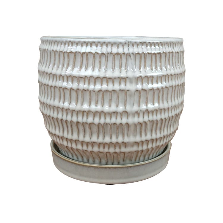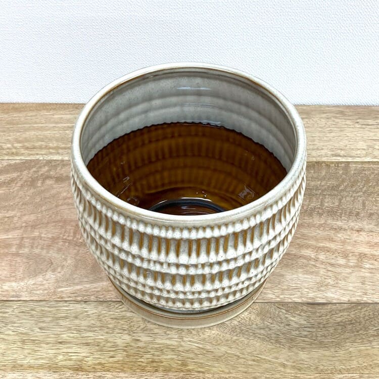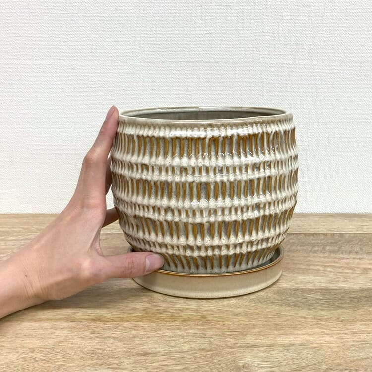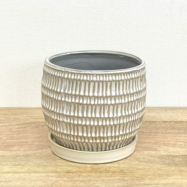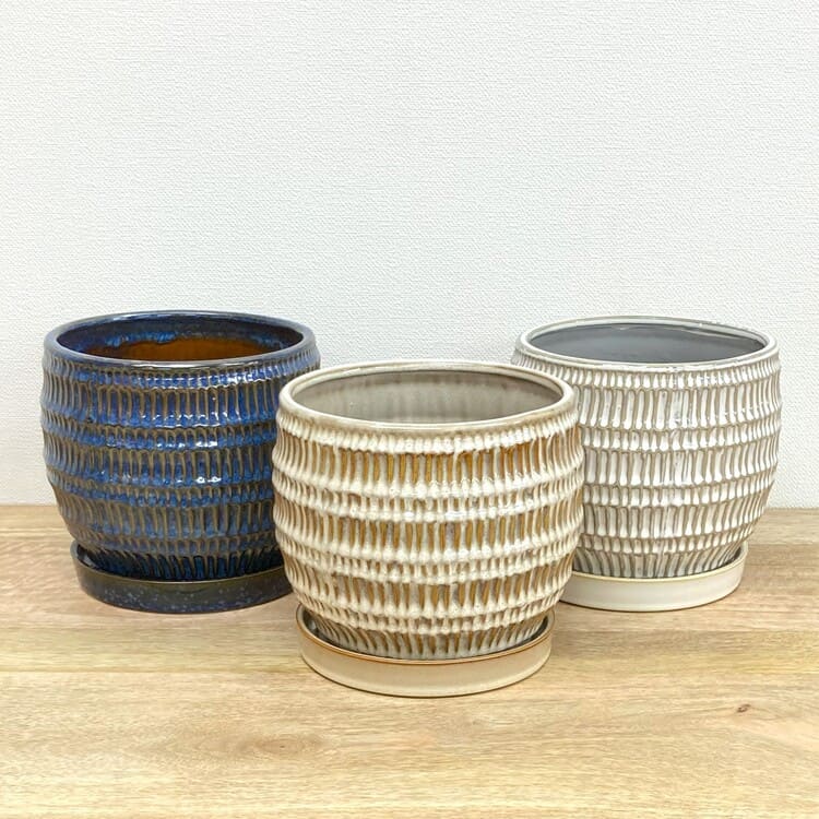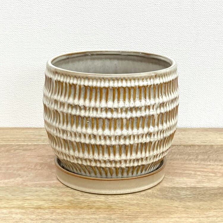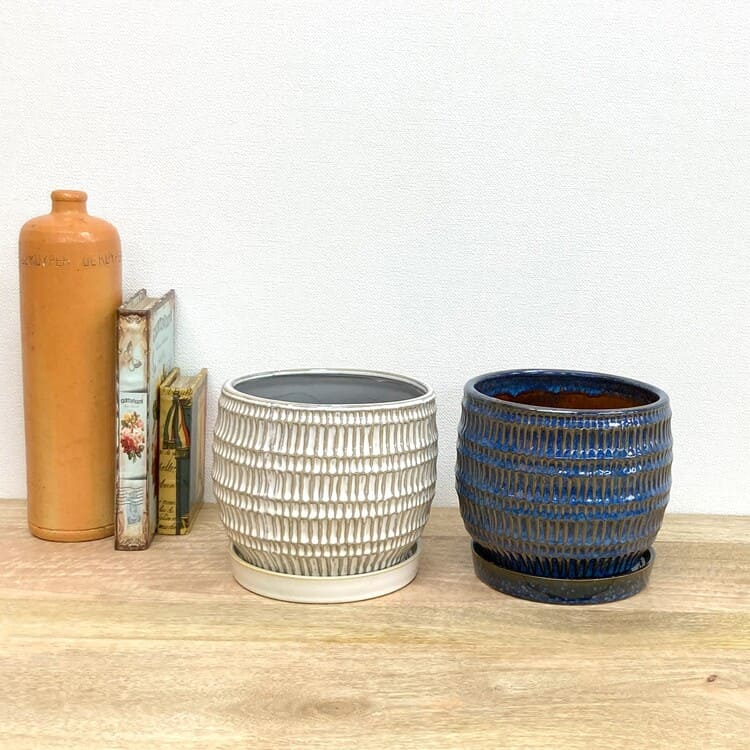 全体が釉薬で仕上げられた陶器らしい質感の植木鉢です。細かな縦向きの目で作られた模様は凹凸になっているため、自然と釉薬の濃淡が生まれて綺麗な発色を作ります。専用の受け皿も全体の姿に合ったちょうど良いサイズです。