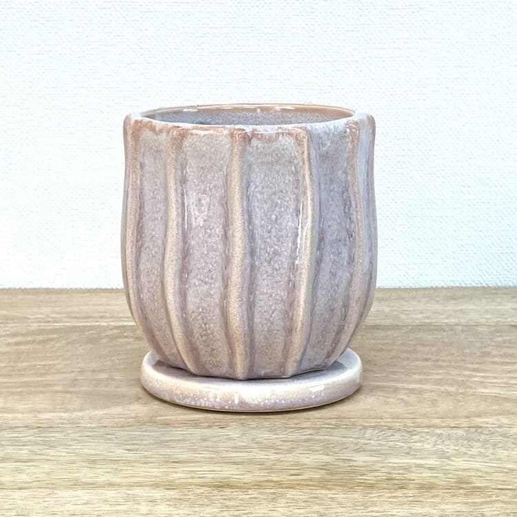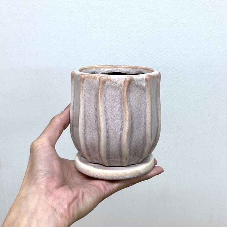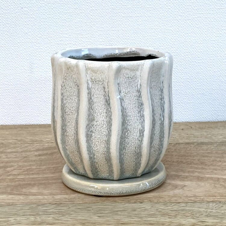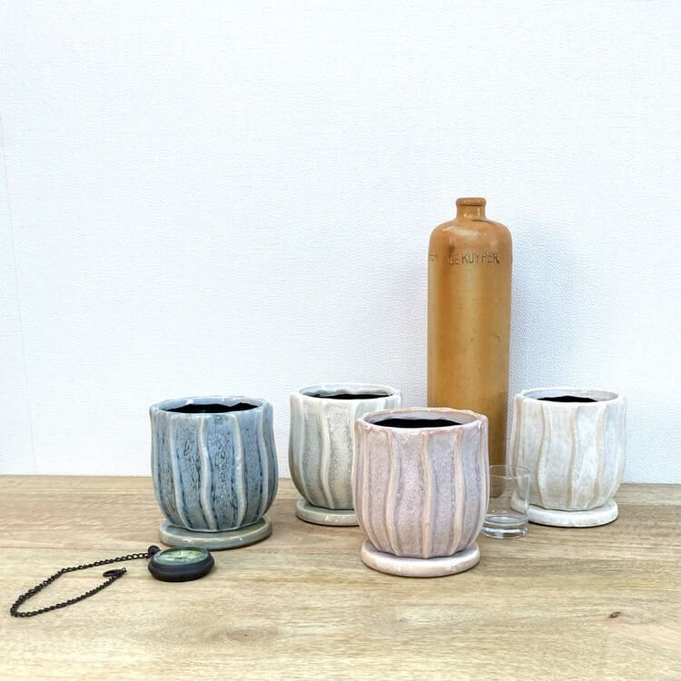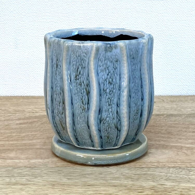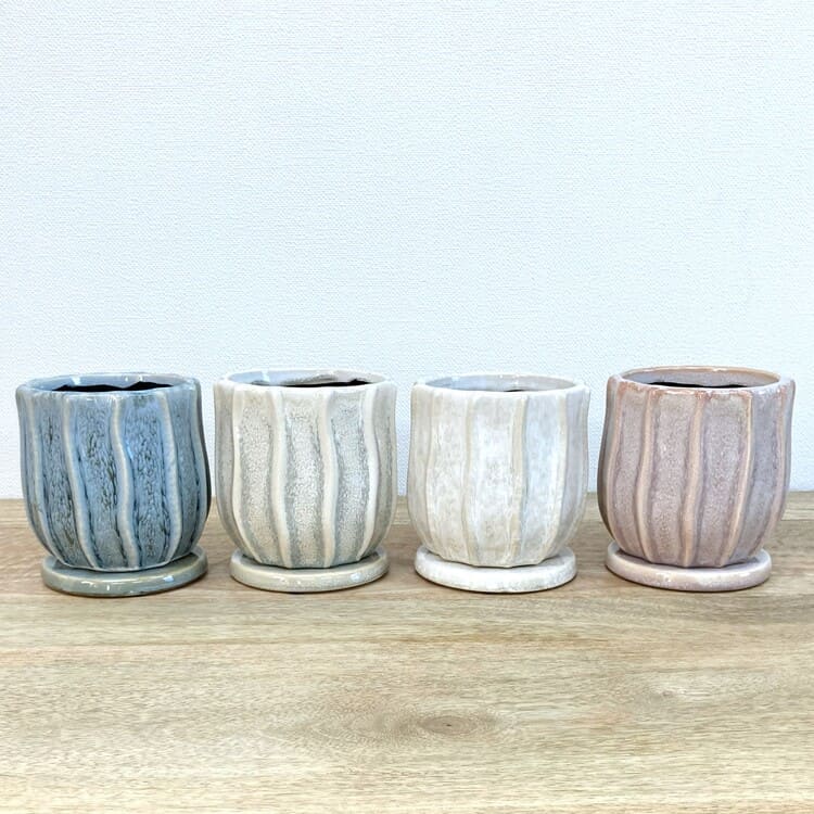 チューリップの花のような形にデザインされた植木鉢。立ち込めた霧のようなグラデーションが繊細な色みを演出しています。釉薬は自然に垂れた濃淡そのままの発色で個体差があります。