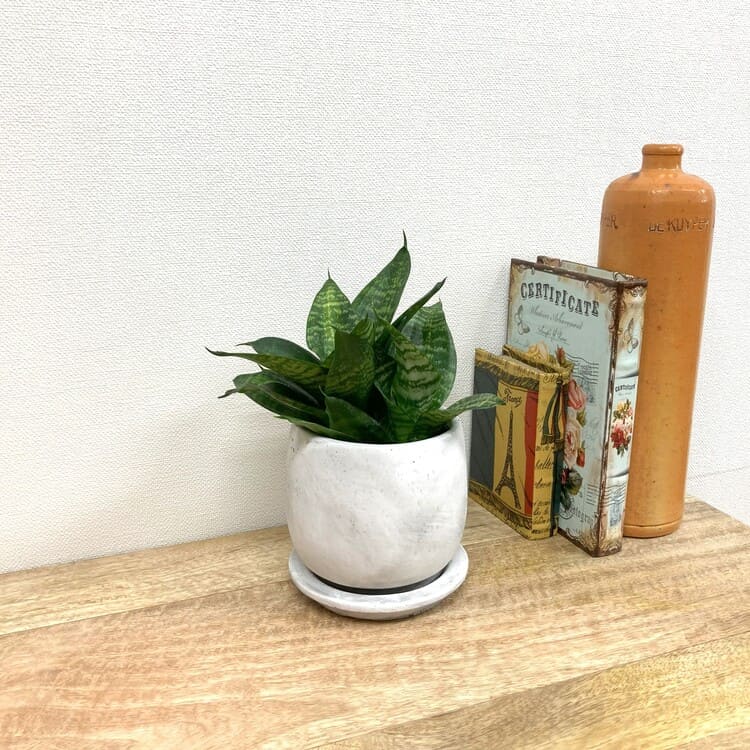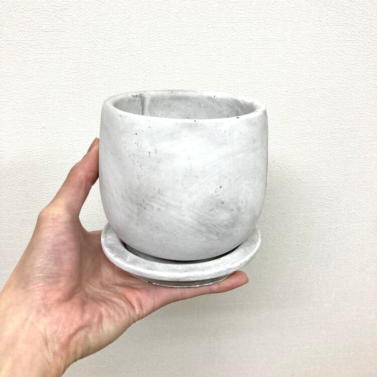 コンクリート調の無機質な質感ながらも、心地よい丸みのあるシンプルな植木鉢です。つばのある受け皿の形も落ち着きが感じられて◎ どんなお部屋の背景とも馴染みやすく、容積のあるシリンダースタイルで扱いやすい植木鉢です。