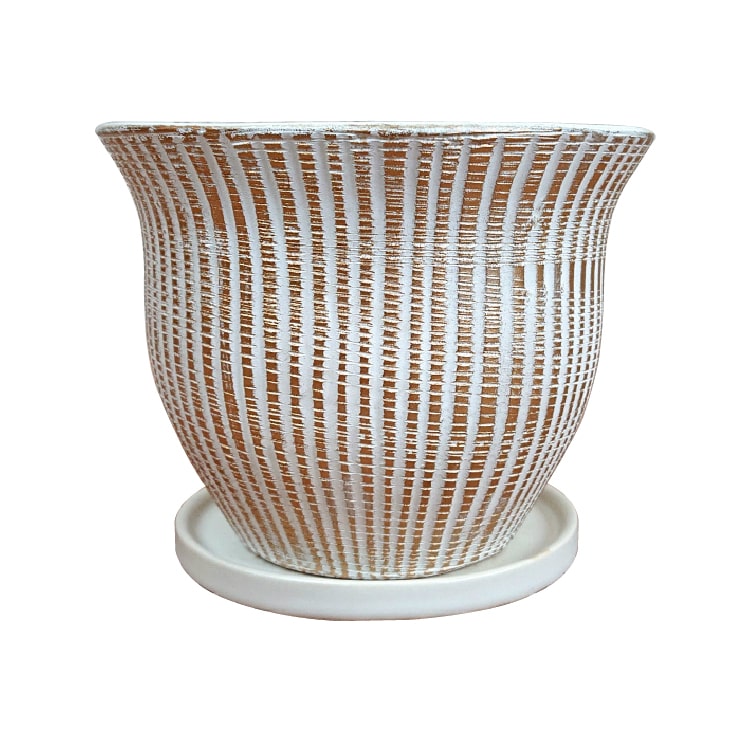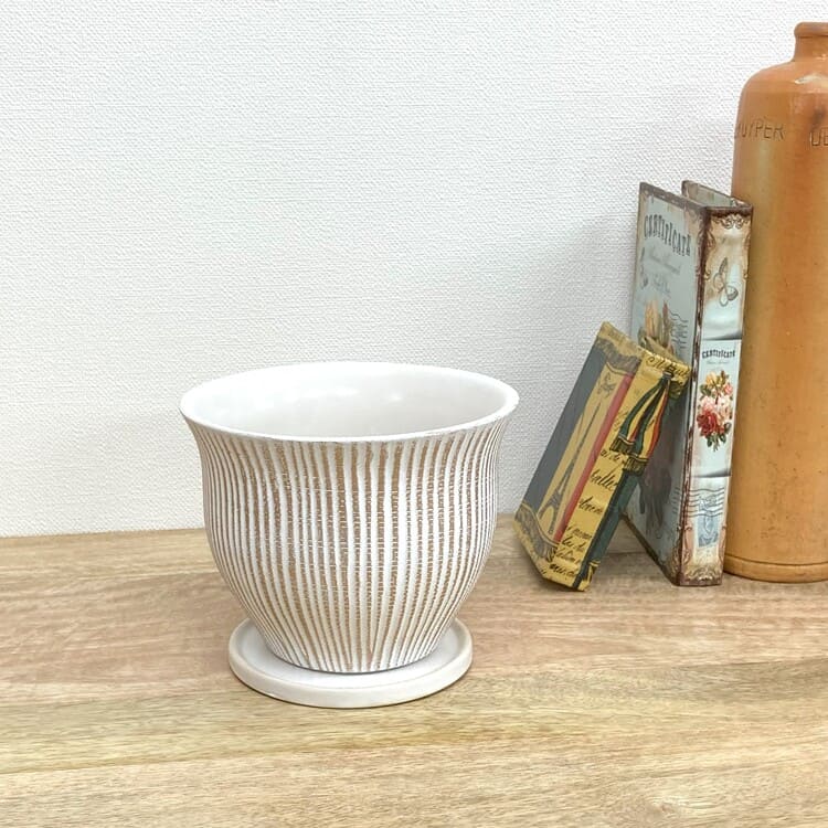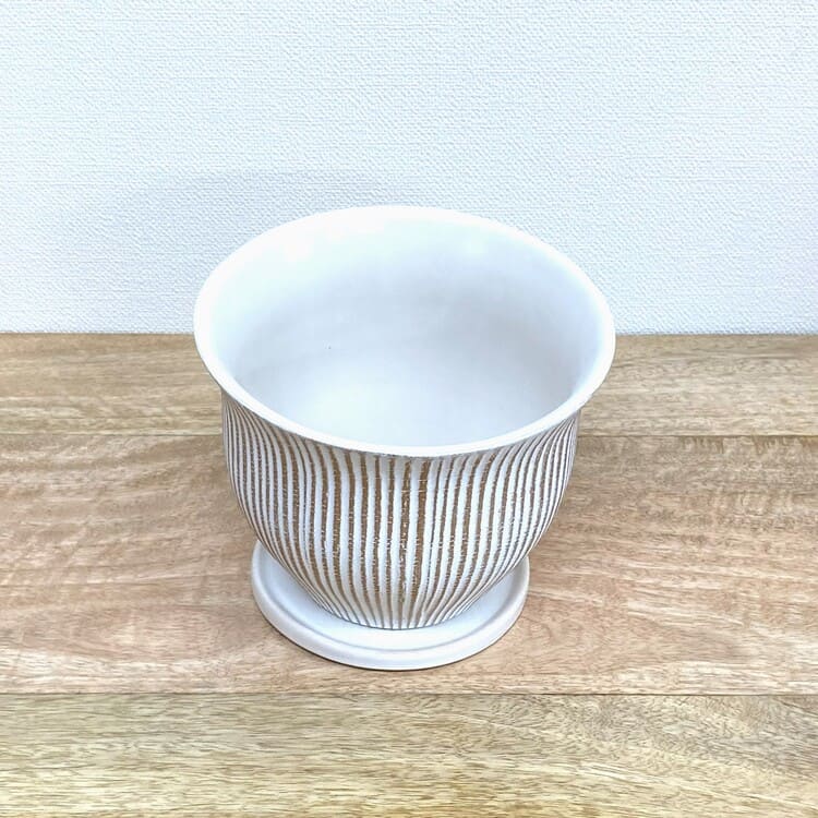 口周りの直径は約13.5cm、その内径は12~13cmです。4号/12cmくらいまでの大きさの植物苗が植えられる目安です。底面はこれより小さいため、場合によっては根の大きさを考慮してください。