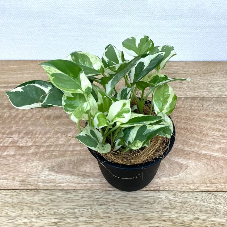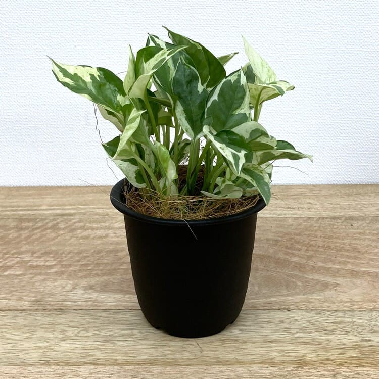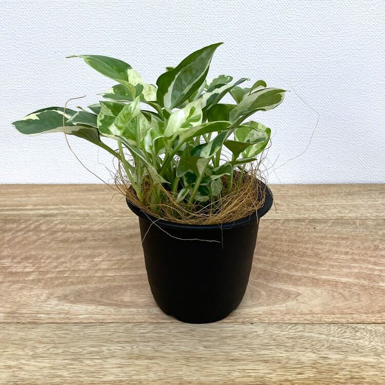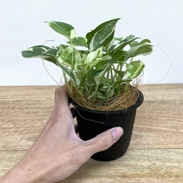 そんなポトス・エンジョイは何といっても濃淡がはっきりとして見ごたえのある葉が一番の魅力。従来のポトスほど大きな株になりにくく、この苗も3号9cmポットで手軽な室内観葉植物としてちょうど良いサイズです。植え込みには3.5号~4号くらいの植木鉢を目安にします。