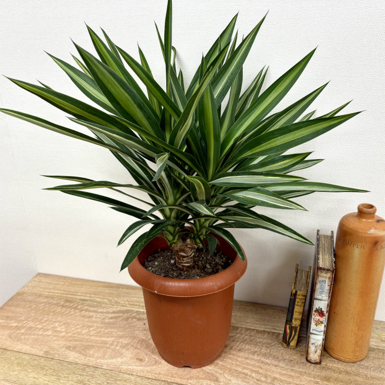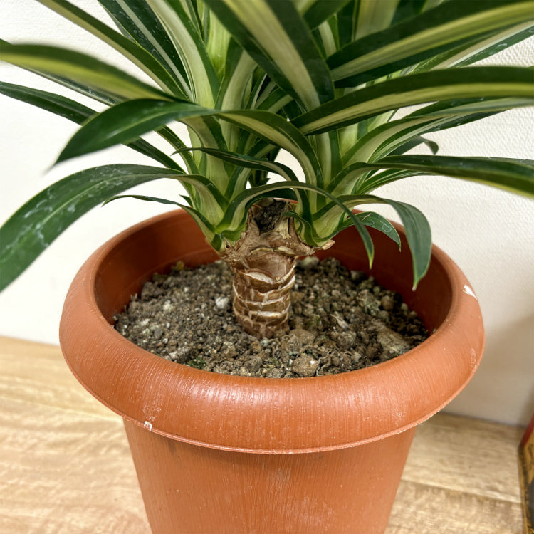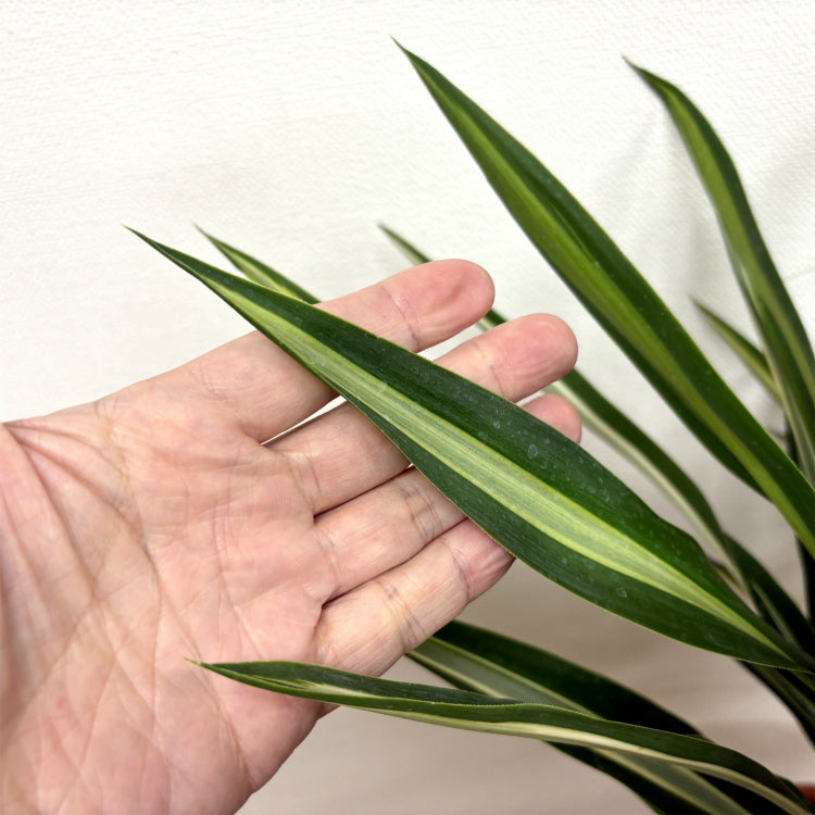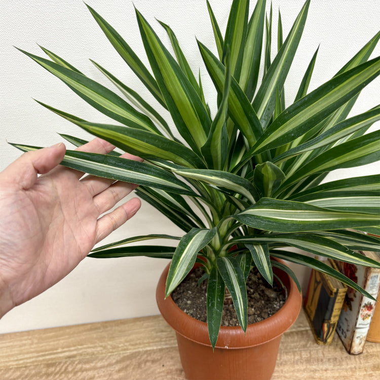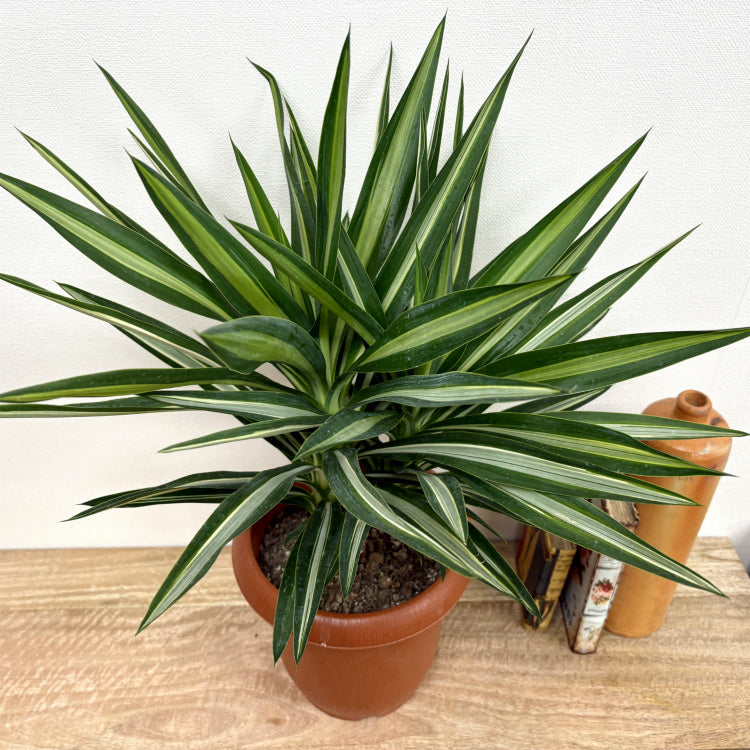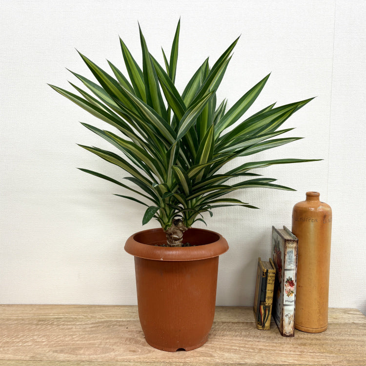 斑入りの細長い葉が特徴的なユッカ・シルバースター。手の込んだ仕立てでボリューム満点。丁寧に育てられたのが想像できる良品です。