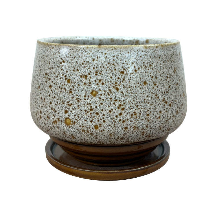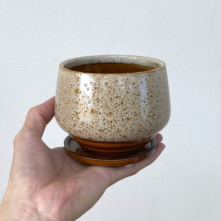 カッチリとした陶器製の植木鉢。柿渋色を基調にした釉薬で落ち着いた印象に、それでいて斑な発色と引き締まった形の足元でダイナミックさも演出。異なる側面を持ち合わせたモダンなアイテムです。