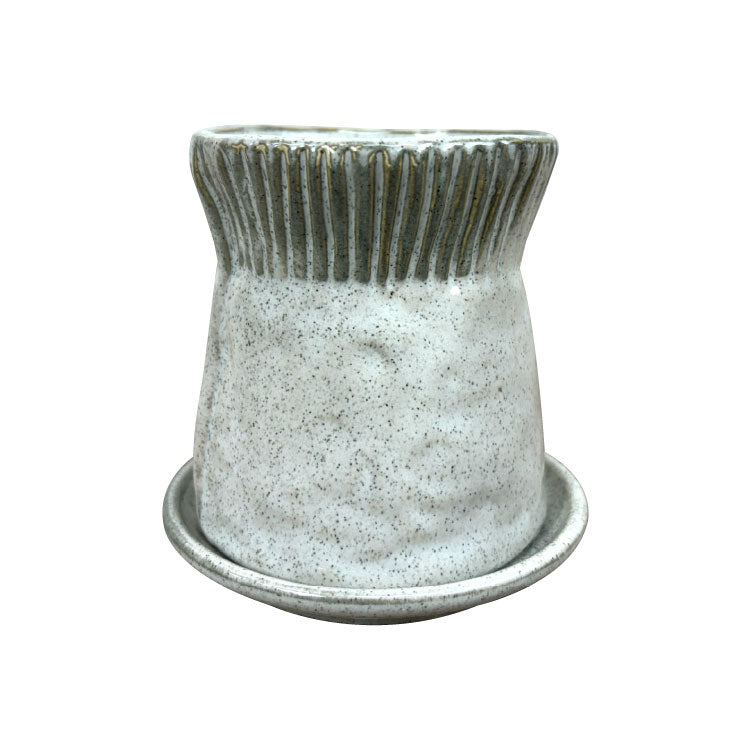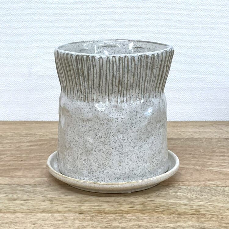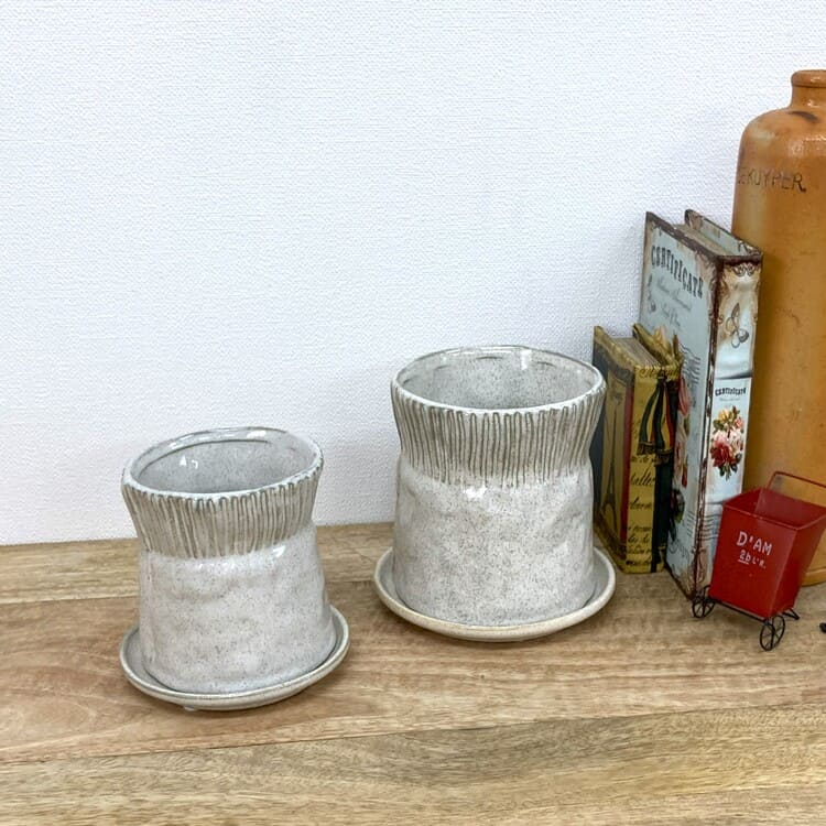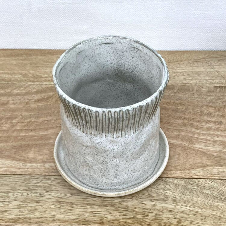 口周りと底の外径は12cmくらい、首元のやや窄む箇所で内径は約11cm程度。組み合わせる植物苗は3.5号くらいが目安になります。受け皿は約15cmのサイズです。
