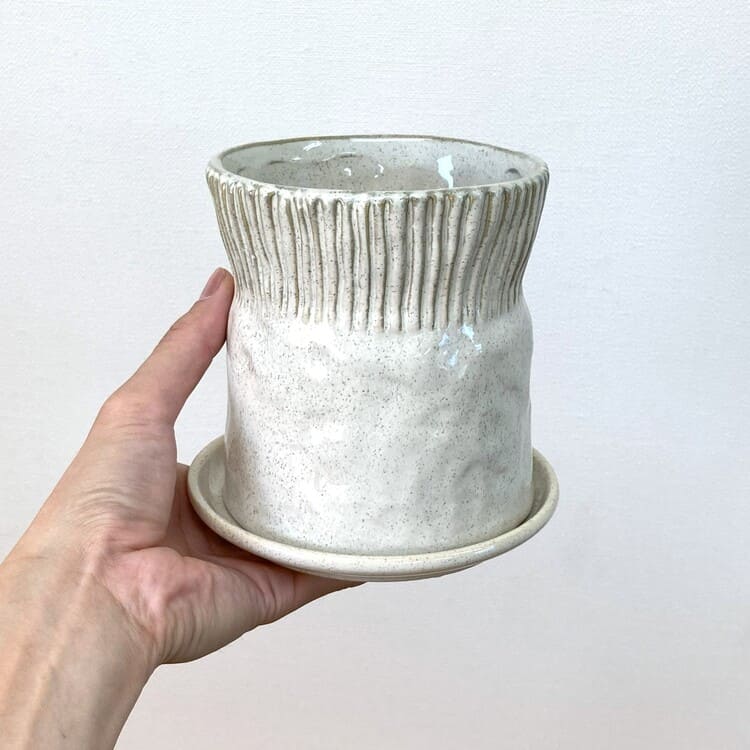 手びねりで成形したように小さな窪みの残る仕上がりになっています。アイボリーホワイトとつやのある釉薬で、控えめな雰囲気ながらも完成度の高い釉薬鉢です。