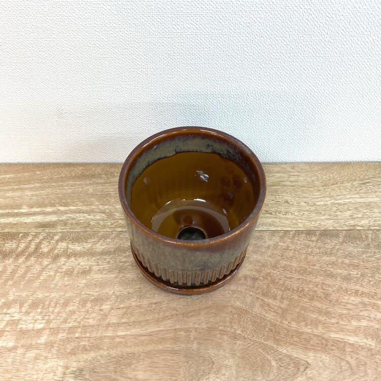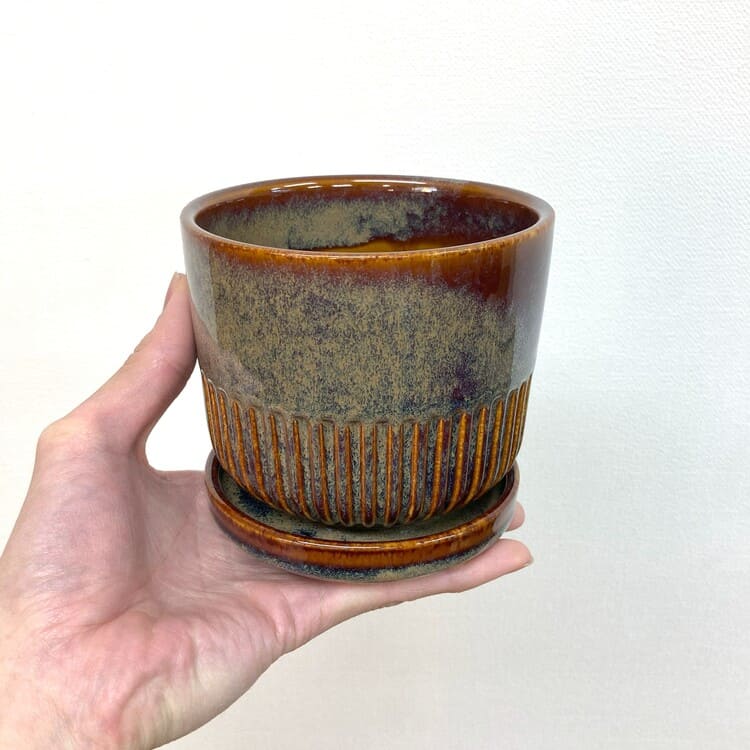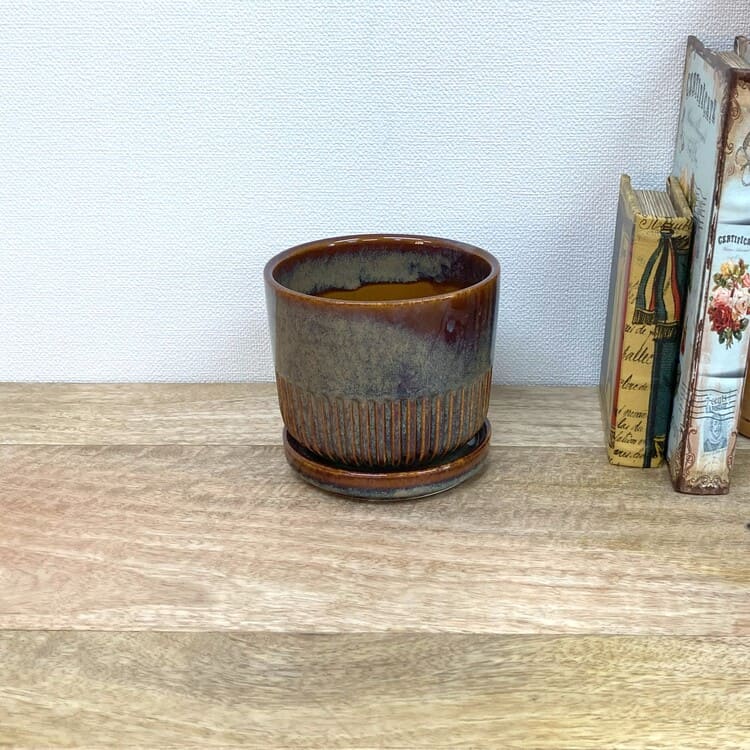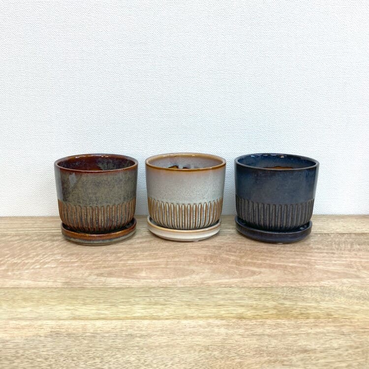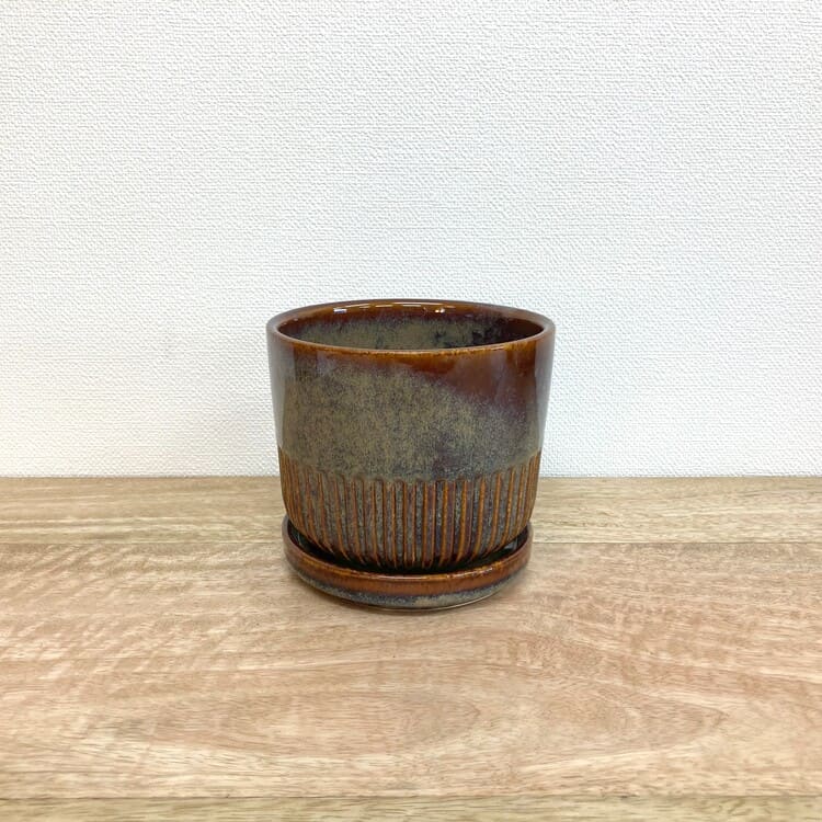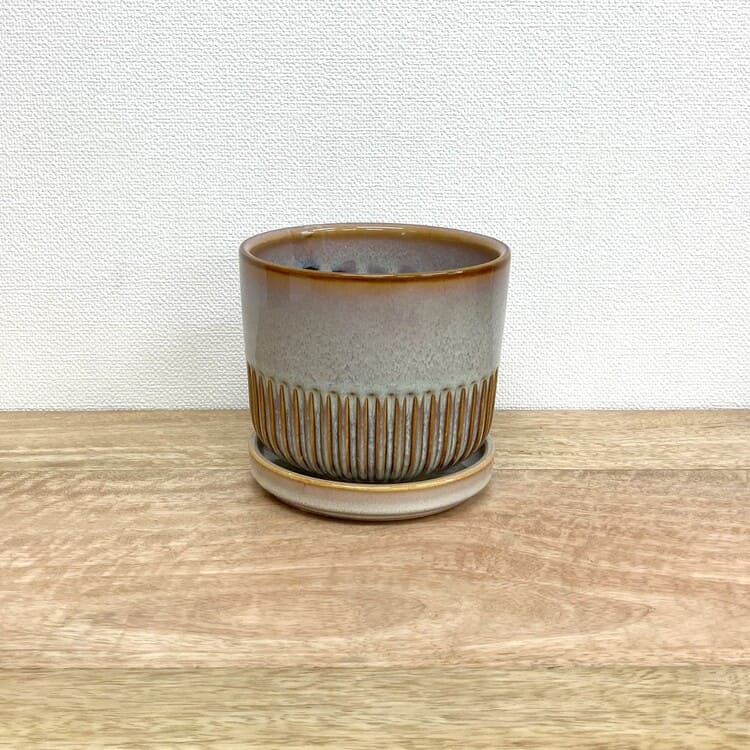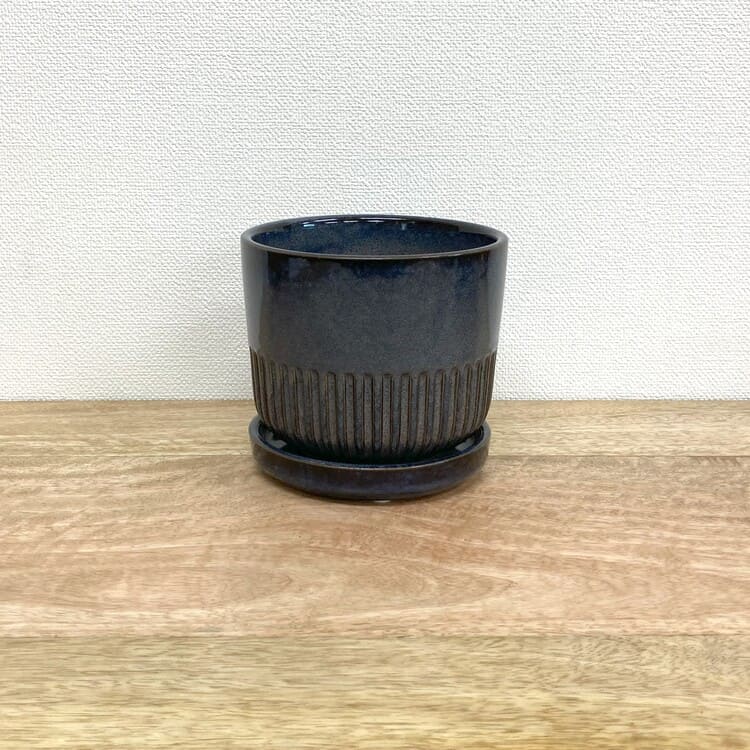 つやのある釉薬をしっかりと纏った上品な植木鉢です。培養土のたくさん入る寸胴型でありながら、腰下から半分はストライプがデザインされており、野暮ったさを感じません。焼き物の植木鉢にこだわりたい方にお勧めの一鉢です。