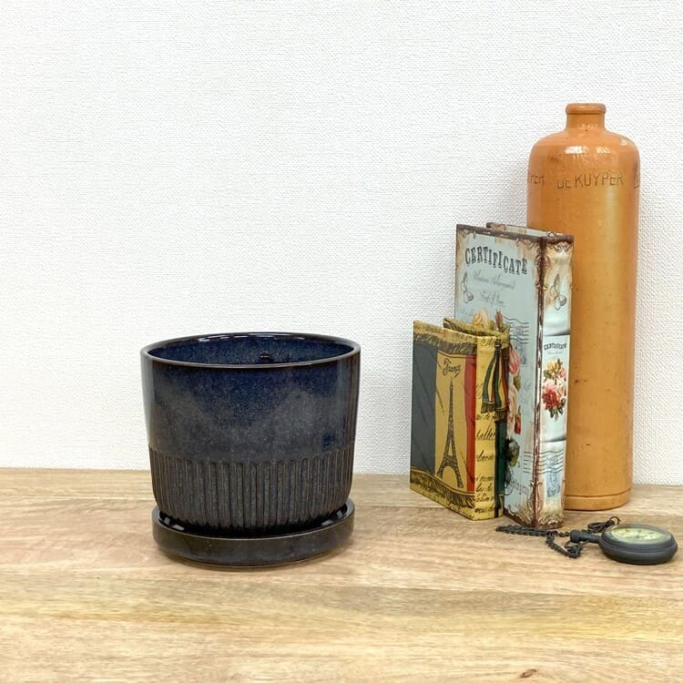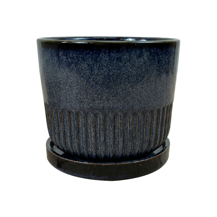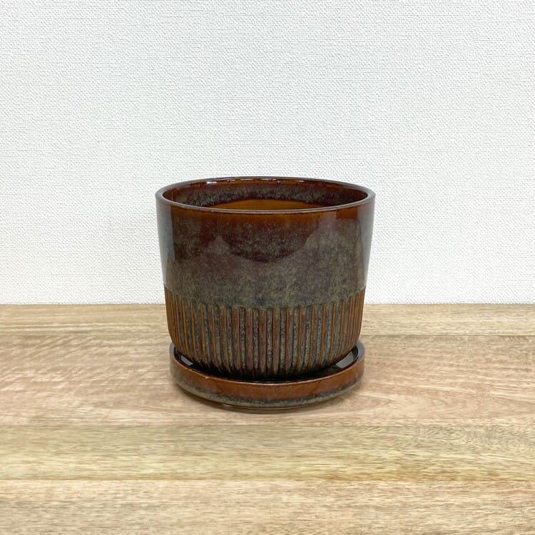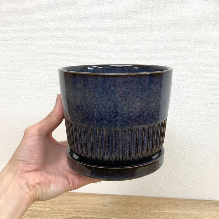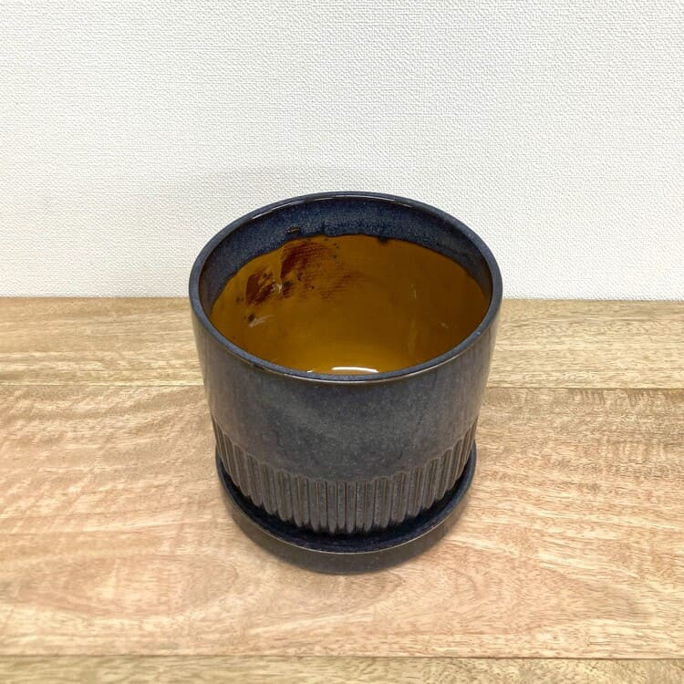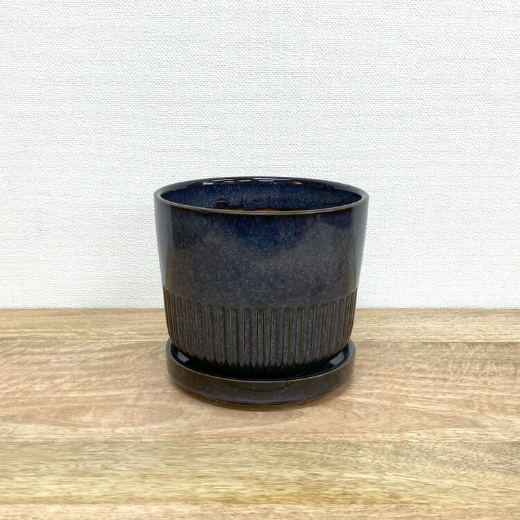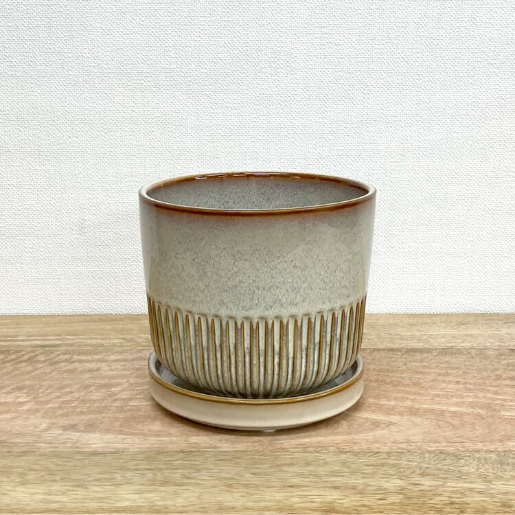 つやのある釉薬をしっかりと纏った上品な植木鉢です。培養土のたくさん入る寸胴型でありながら、腰下から半分はストライプがデザインされており、野暮ったさを感じません。焼き物の植木鉢にこだわりたい方にお勧めの一鉢です。