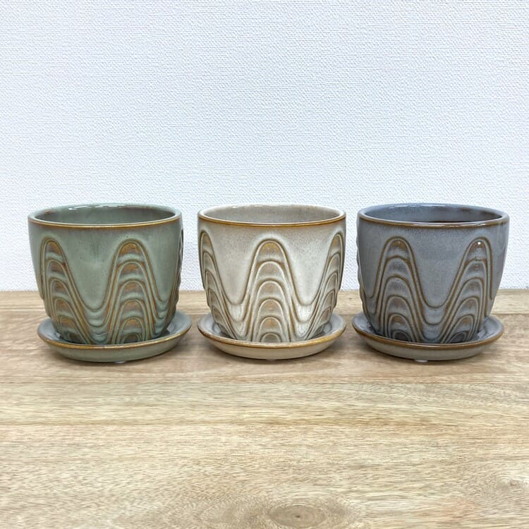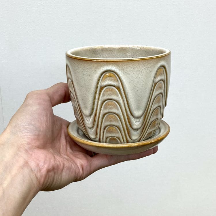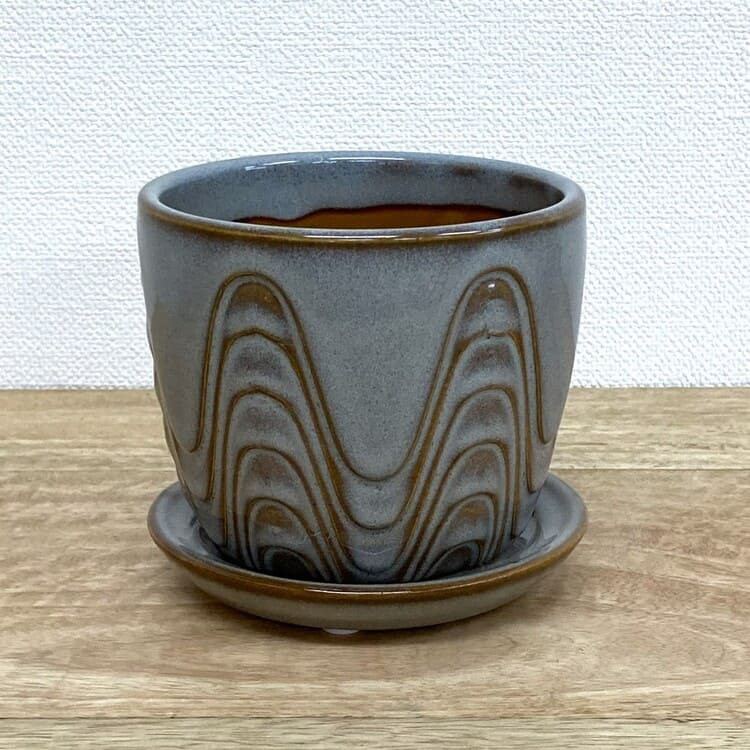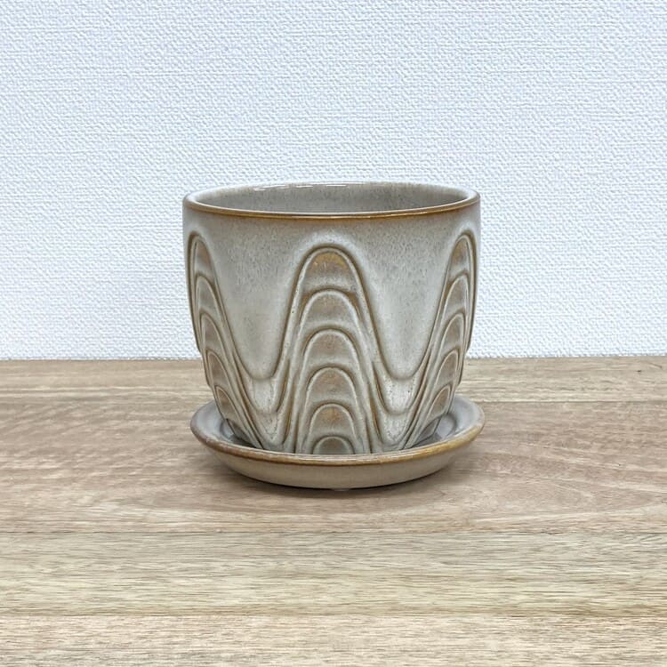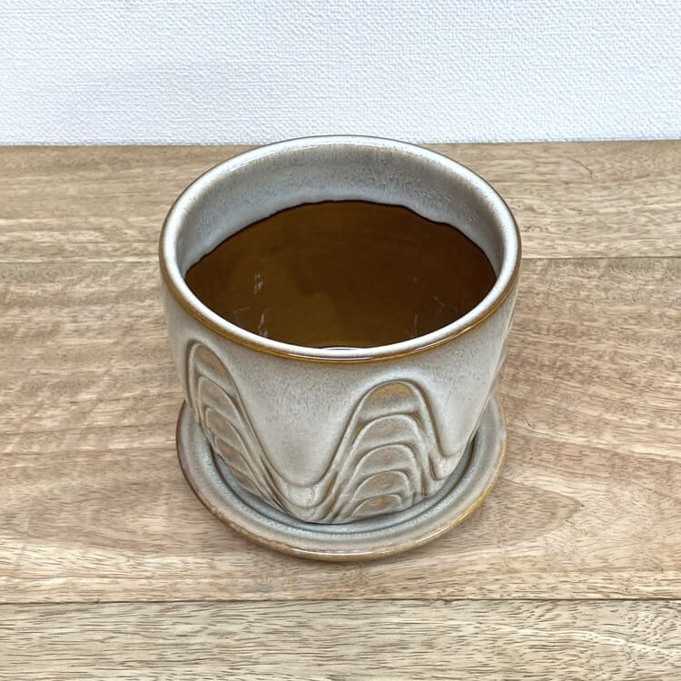 外径は11cm、適度な厚みで内径9cm少々。3号の植物苗を納めるのに適合した大きさです。ちょうどよいサイズの受け皿が全体をバランスよくまとめます。