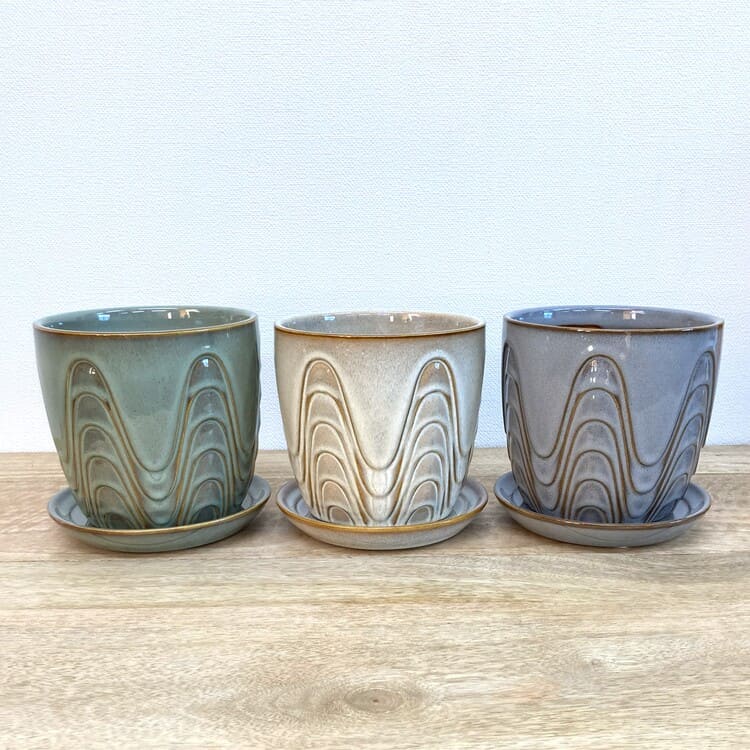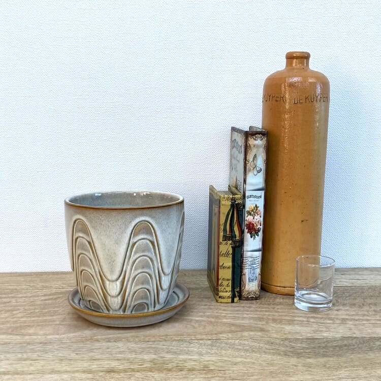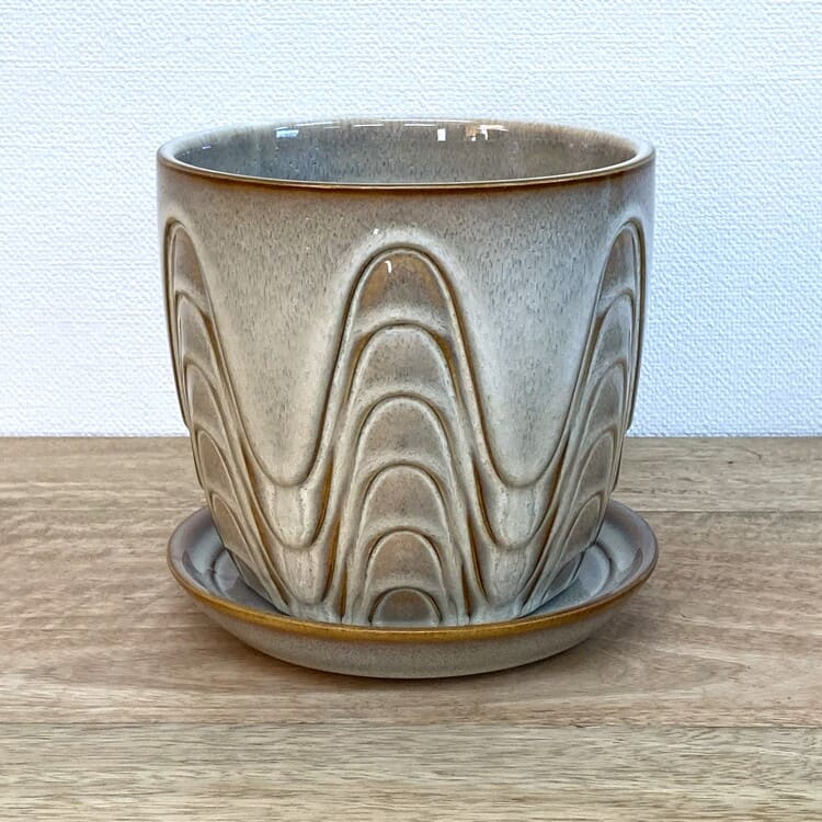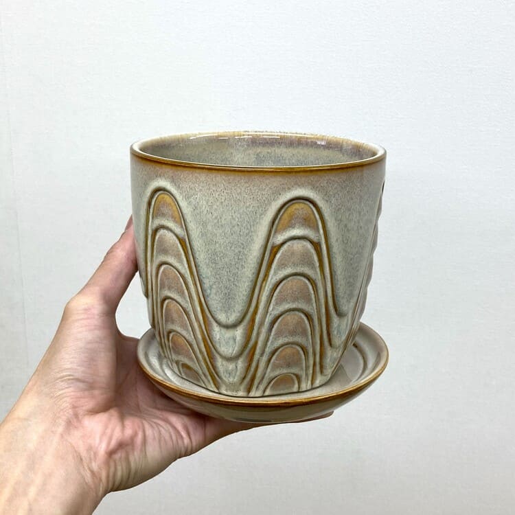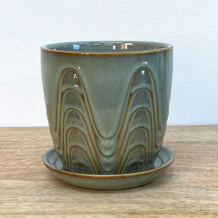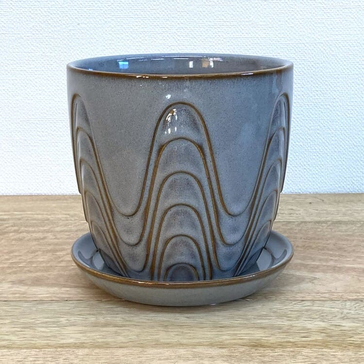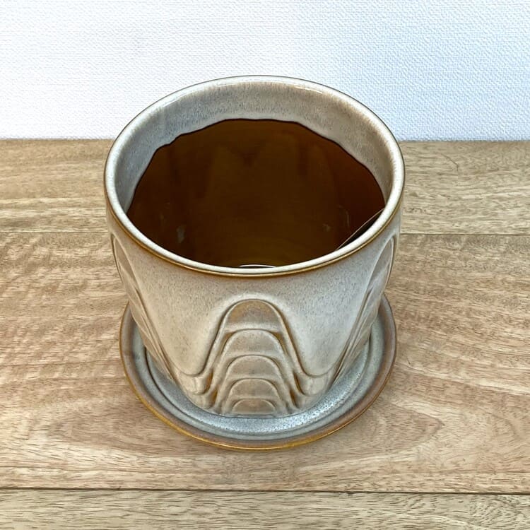 外径は14cm、適度な厚みで内径12.5cmほど。4号の植物苗を納めるのに適合した大きさです。ちょうどよいサイズの受け皿が全体をバランスよくまとめます。