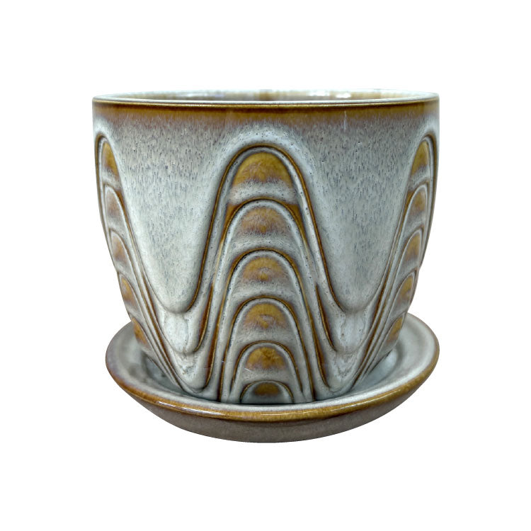 中間色の釉薬をたっぷりと纏わせた陶器鉢です。雫がこぼれるような凹凸のあるデザインが釉薬の自然な濃淡を作り出し、美しいグラデーションを現します。
