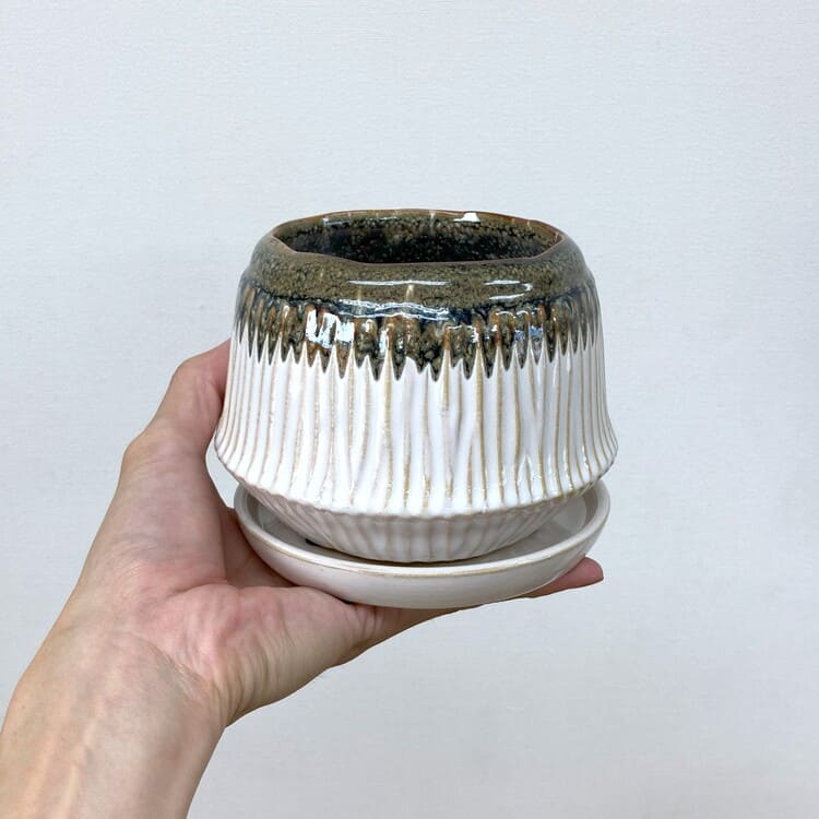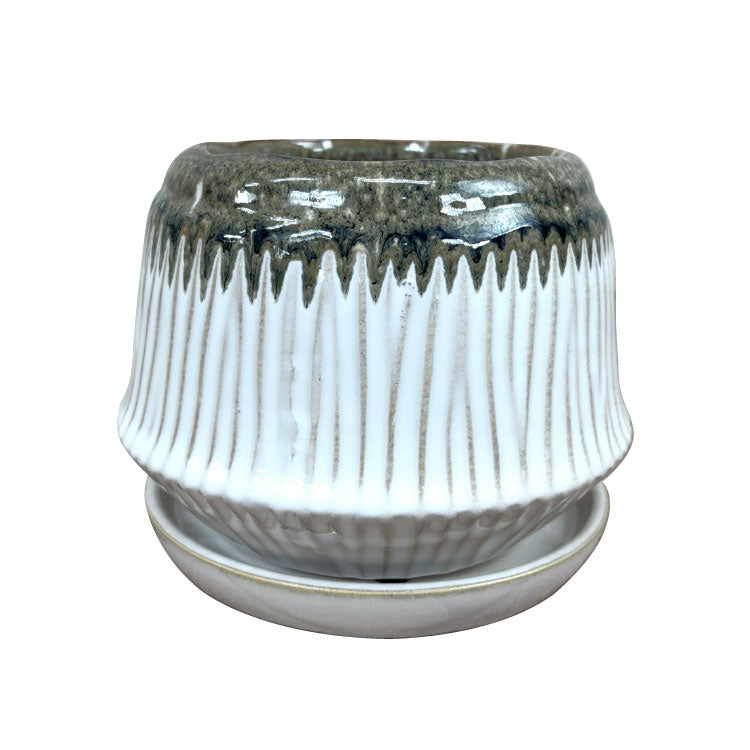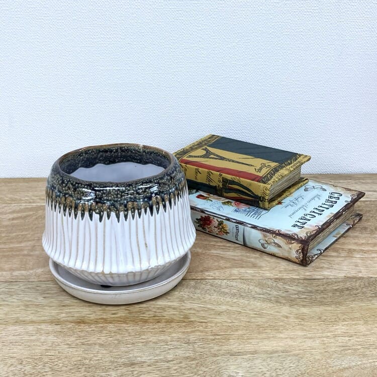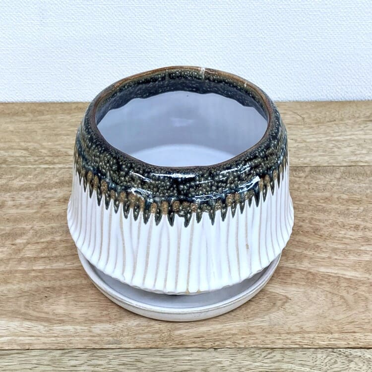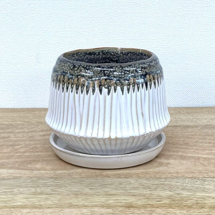口元がきゅっと窄まった、ちょっと珍しい円盤のような植木鉢です。受け皿も統一感があり完成度の高いデザインになっています。