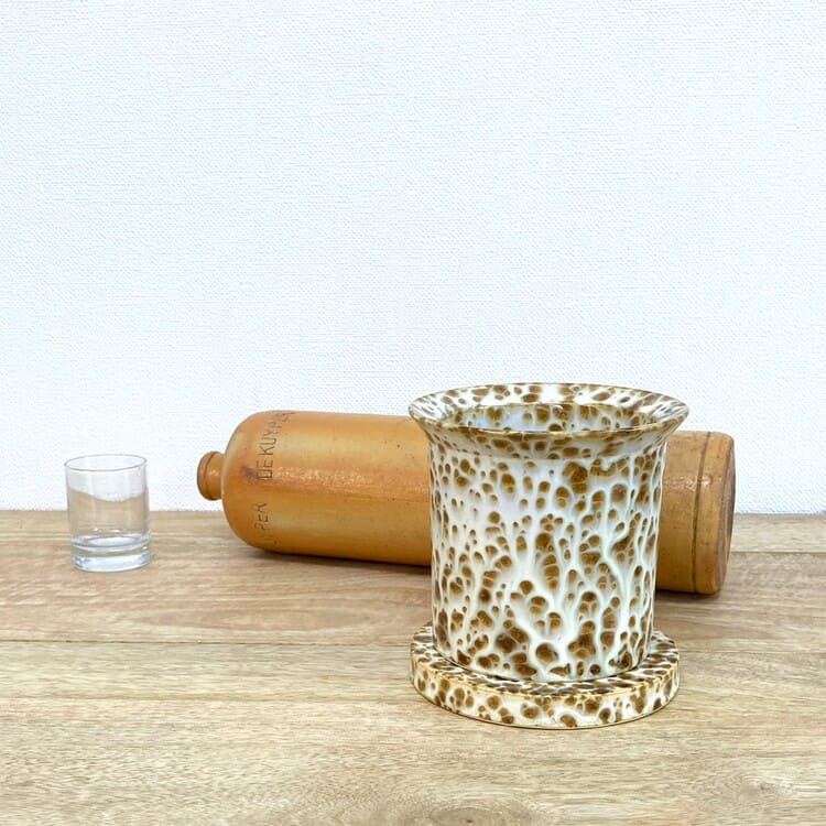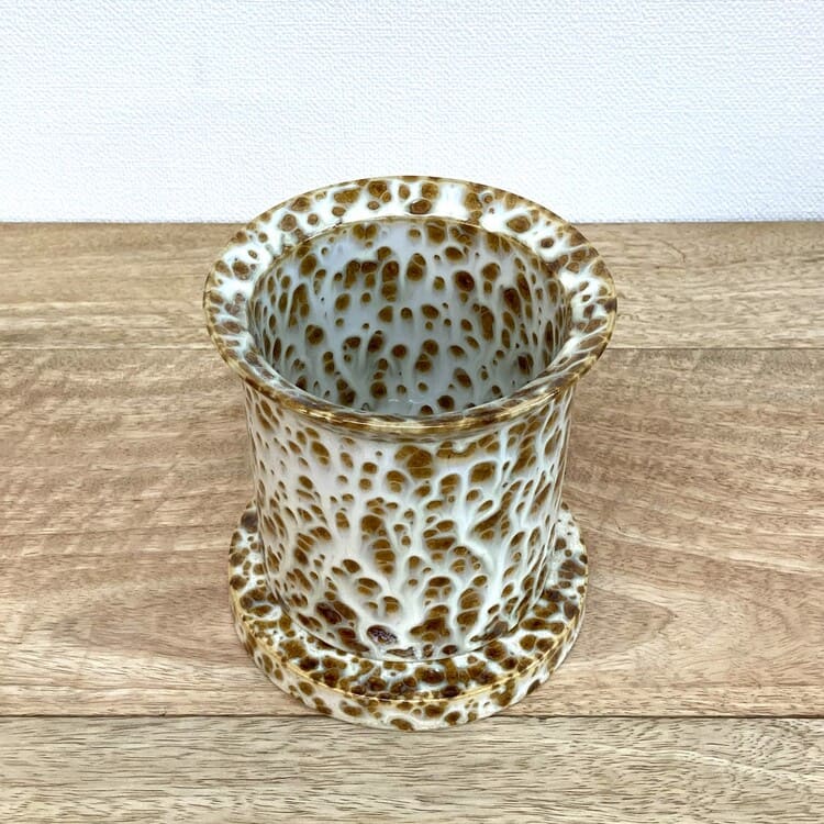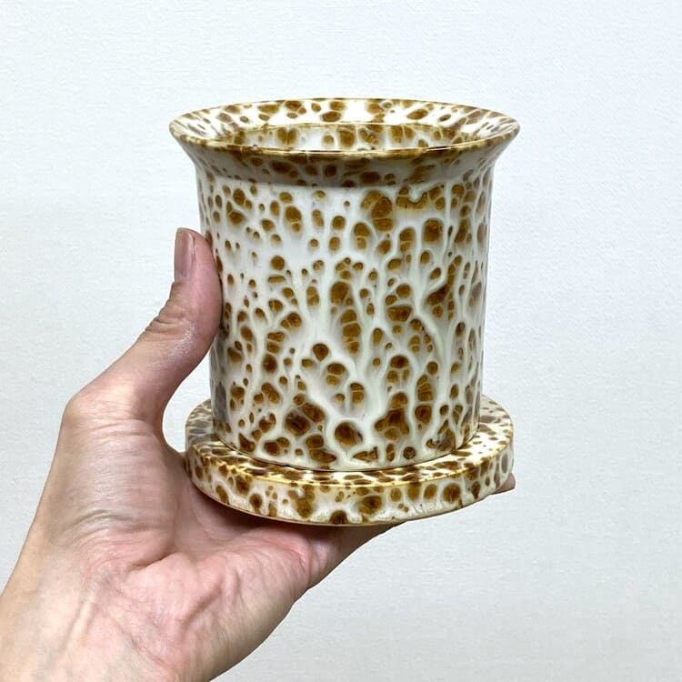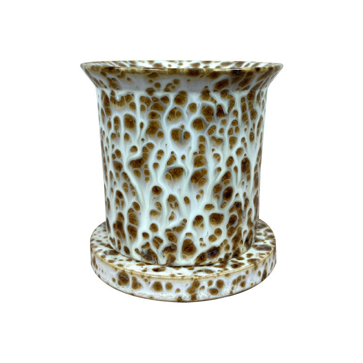 個性的な斑点の模様を描く釉薬をまとった植木鉢。さながらヒョウのように迫力のある印象です。形はいたってシンプル、シリンダー型の器とデザイン重視のプレート状の受け皿となります。